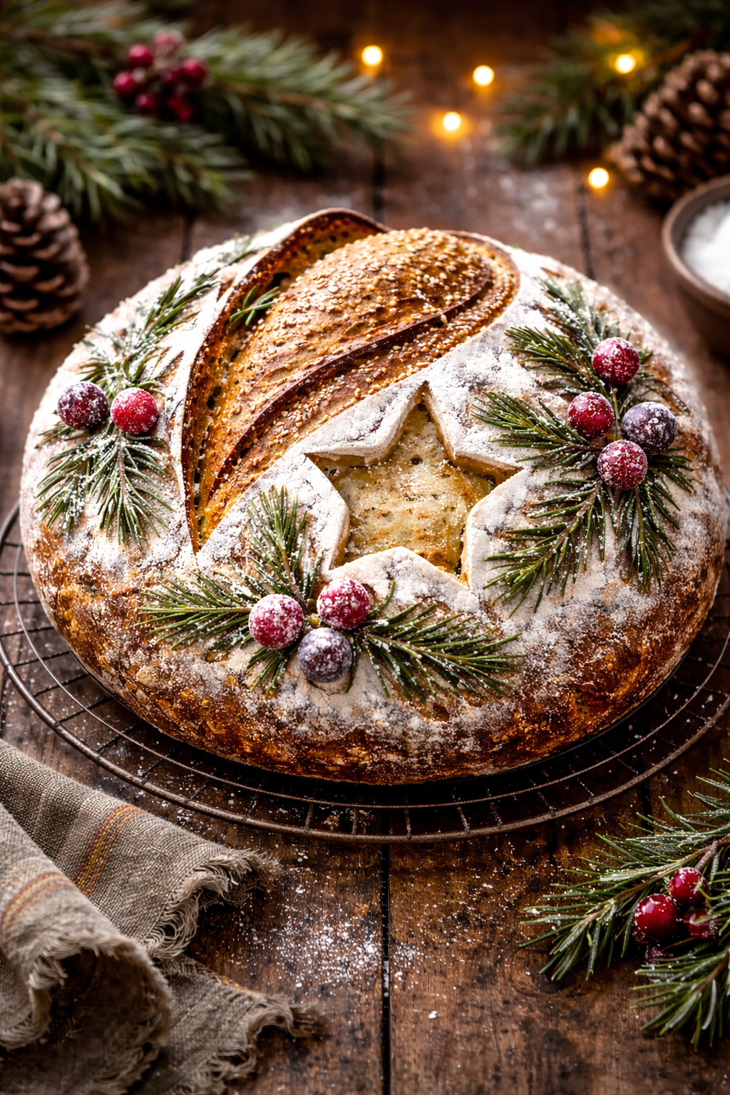 🌾 Ingredients 100 g active sourdough starter 350 g lukewarm water 500 g bread flour 10 g salt Rice flour (dusting ke liye) Decoration (optional but magic): Fresh rosemary Few cranberries Little flour (snow look ke liye) 🍞 Method (Simple & Real Homemade) Mix Starter + water mix karo Flour…