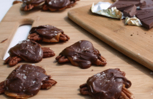Line a baking pan with a silpat or parchment paper. Arrange pecans in groups of 3. Lightly toast pecans. Top each cluster with an unwrapped caramel. Soften in the oven for just a few minutes.
